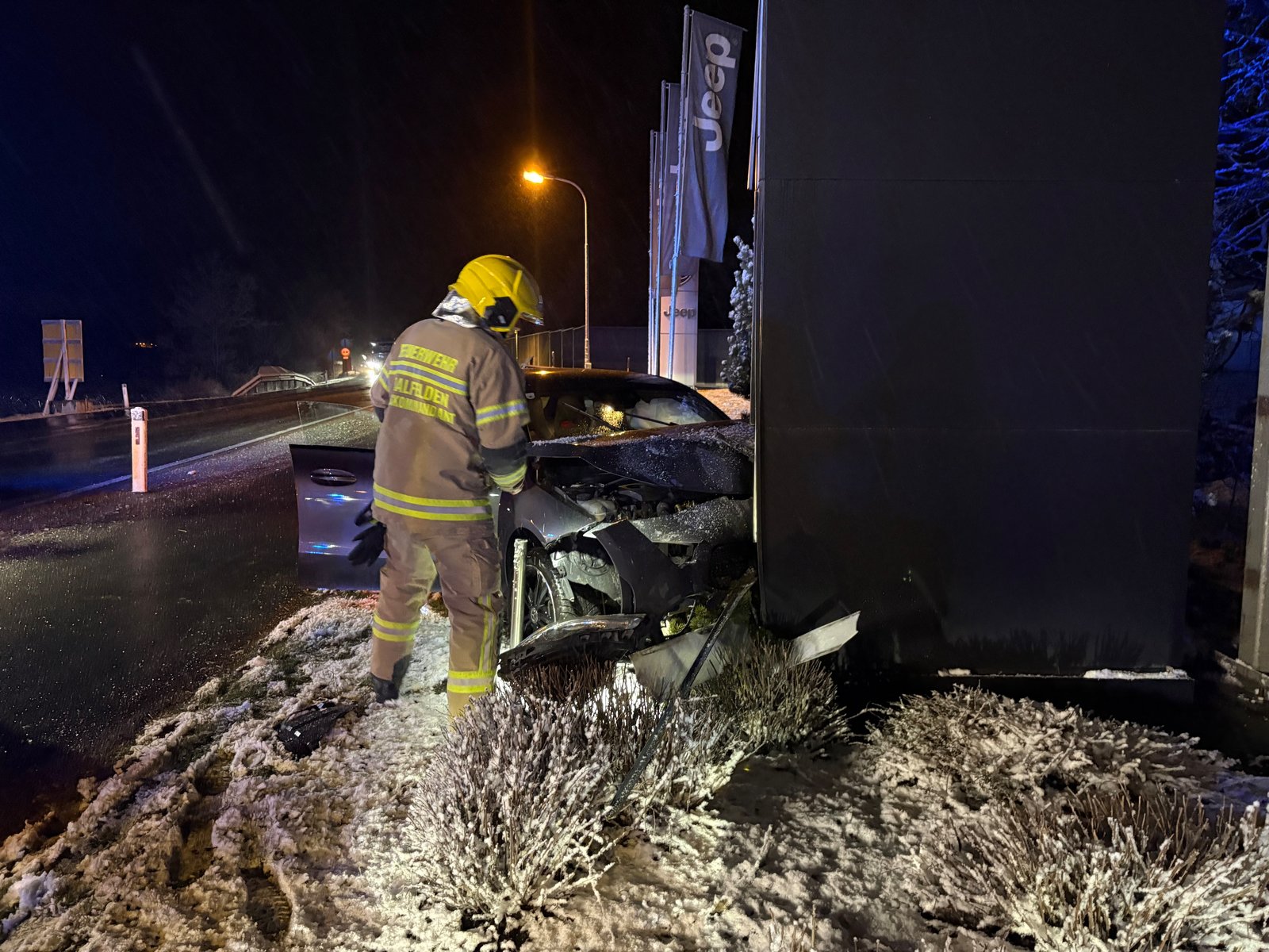 Ein PKW kam von der Fahrbahn ab und kollidierte mit einem Werbepylon. Die Feuerwehr sicherte die Unfallstelle ab. Anschließend wurde diese von der Polizei übernommen.