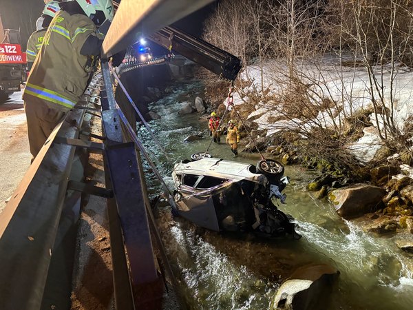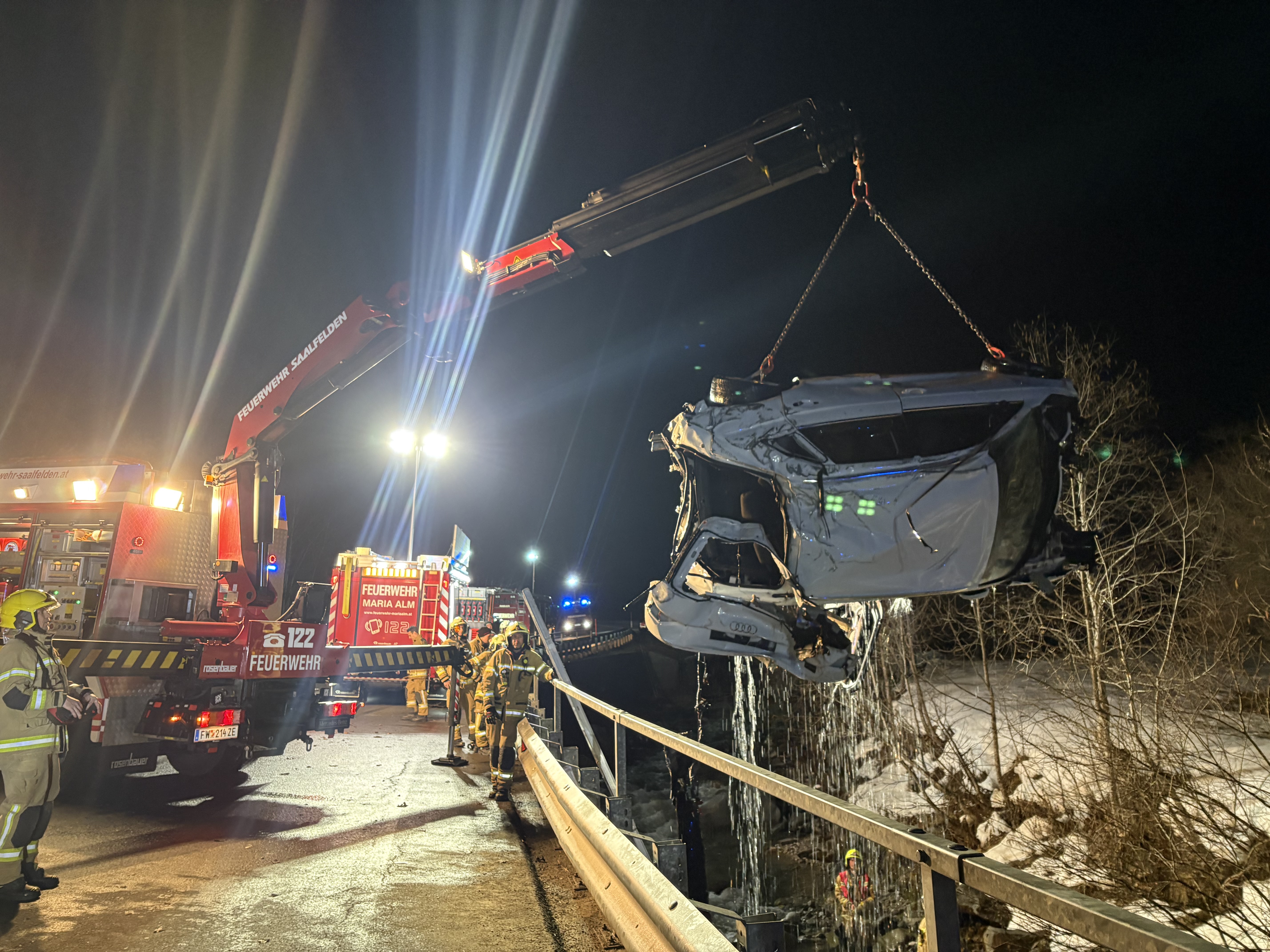 Am 08.03.2026 wurde um ca. 20:45Uhr die Feuerwehr Maria Alm zu einem schweren Verkehrsunfall auf der B164 Hochkönigbundesstraße alarmiert. Nach eintreffen fand der Einsatzleiter Maria Alm folgende Lage vor: PKW seitlich liegend in Bachbett, mehrere Personen im Fahrzeug.