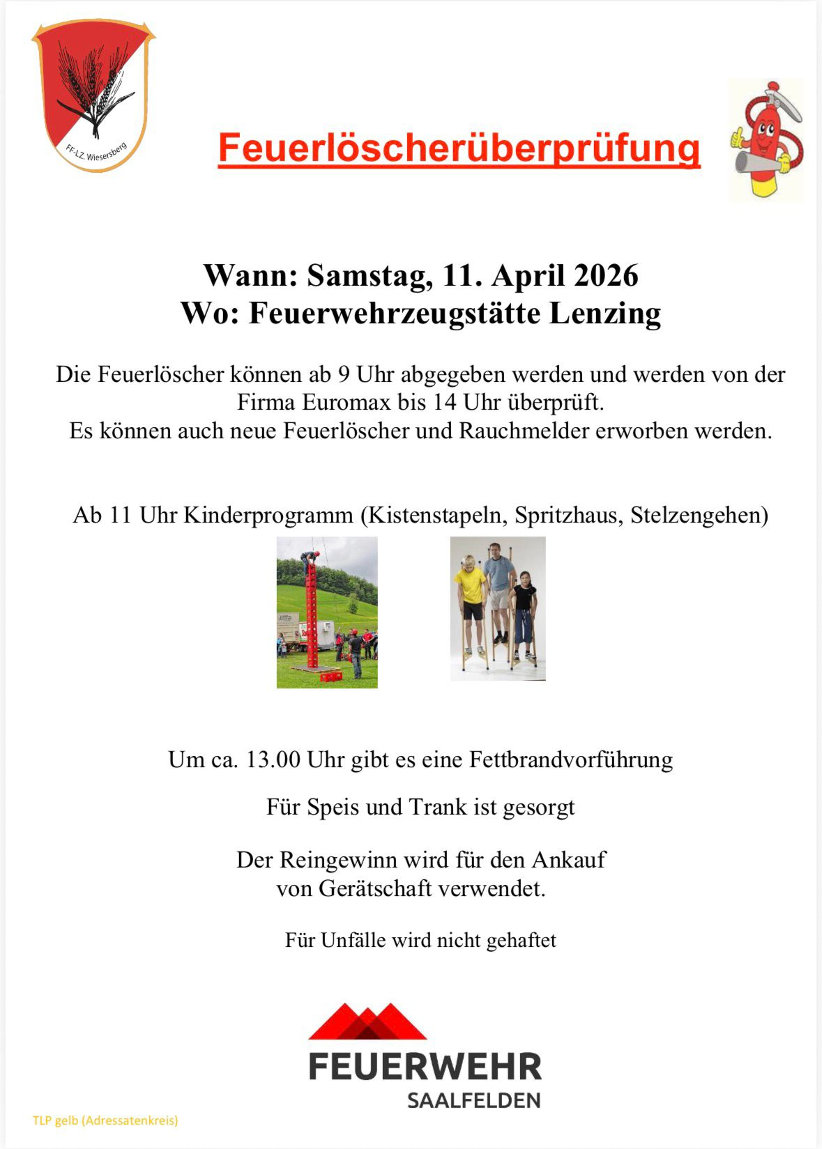 Am Samstag den 11. April 2026 findet die diesjährige Feuerlöscherüberprüfung bei der Zeugstätte des Löschzuges Wiesersberg statt. Für das leibliche Wohl ist bestens gesorgt.